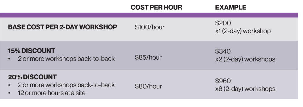 Cost range is based on volume. Programming is scheduled per classroom.